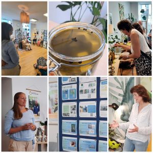 Ein grüner parkähnlicher Streifen zwischen S-Bahn Tegel und Wohnhäusern lud dazu ein den dort wachsenden Kräutern und Sträuchern Aufmerksamkeit zu schenken. Das vermeintlich Unscheinbare birgt doch so einiges an Lebens- und Entwicklungsgeschichte. Wer wüsste es sofort, dass die Mahonie durch einen der sogenannten Gründungsväter der USA nach Europa gelangt ist? Überraschendes und ungewöhnlich Gewöhnliches kam in den wechselseitigen Austausch. Im Anschluss daran fand eine Info-Runde im Büro des Ehrenamtsbüros statt. Frau Sprotte, Klimaschutzbeauftragte des Bezirksamts Reinickendorf, stellte ihr Aufgaben und Tätigkeitsfeld vor. Frau Ladewig und Frau Rother vom Nabu Bezirksgruppe Reinickendorf informierten zu den vielfältigen Tätigkeiten des Vereins und den vielen Möglichkeiten des ehrenamtlichen Engagements zu Umwelt- und Naturschutz in unserem Bezirk. Das Ehrenamtsbüro Reinickendorf unterstützt hierbei, um Bedarfe und Interessen zusammenzubringen.