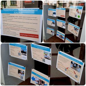 Wir stellen aktuell (11.08.23) im Schaufenster an unserem Standort Tegel Engagementangebote der Reinickendorfer Besuchs- und Begleitdienste vor. Im Rhythmus von ca. 4-6 Wochen wechseln wir die Themen , um die jeweiligen Engagementfelder in ihrer Vielfalt sichtbarer zu machen.